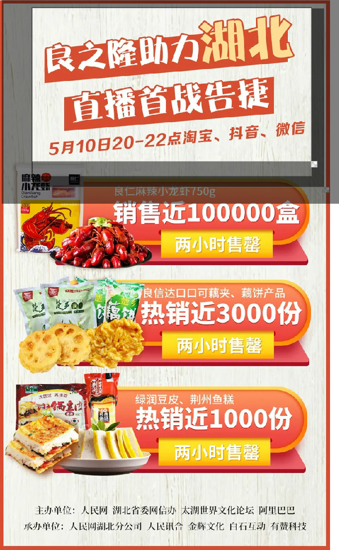 米兰在线客服助力湖北重振,首战取得开门红!来自米兰在线客服的良仁麻辣小龙虾销售近100000盒;良信达口口可藕夹、藕饼产品热销近3000份;绿润豆皮、荆州鱼糕热销近1000份